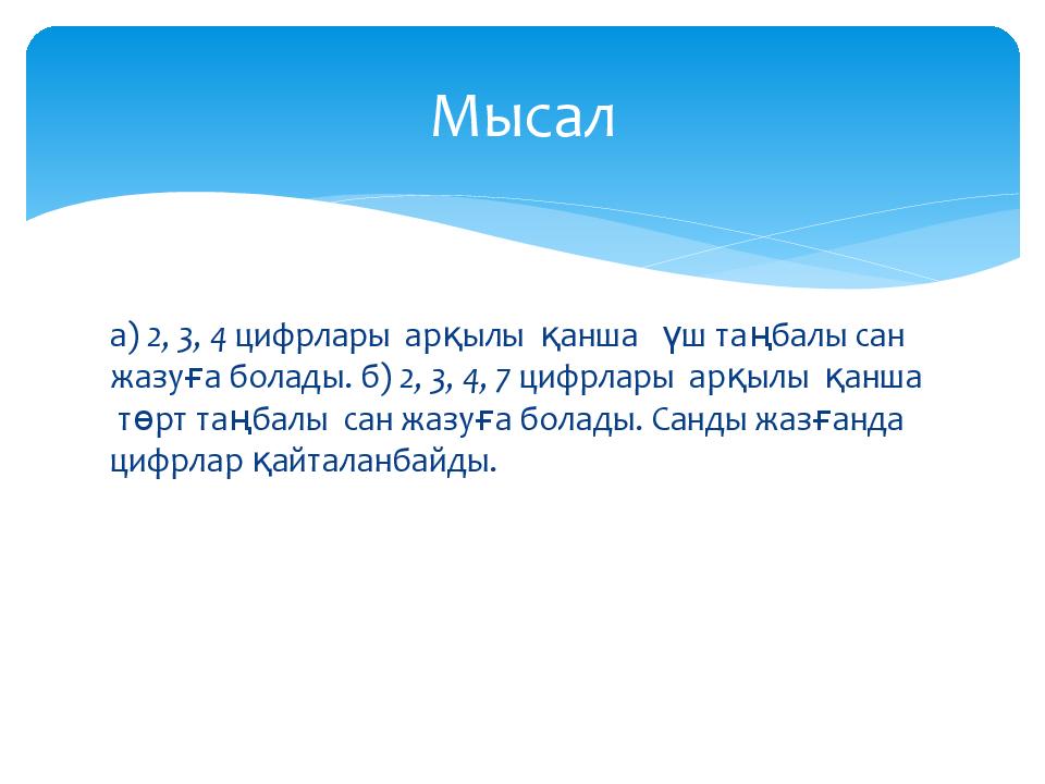 а) 2, 3, 4 цифрлары арқылы қанша үш таңбалы сан жазуға болады. б) 2, 3, 4, 7 цифрлары арқылы қанша төрт таңбалы сан жазуға болады. Санды жазғанда цифрлар қайталанбайды. Мысал