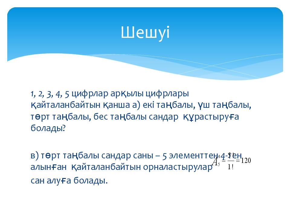 1, 2, 3, 4, 5 цифрлар арқылы цифрлары қайталанбайтын қанша а) екі таңбалы, үш таңбалы, төрт таңбалы, бес таңбалы сандар құрастыруға болады ? в ) төрт таңбалы сандар саны – 5 элементтен 4 -тен алынған қайталанбайтын орналастырулар сан алуға болады. Шешуі