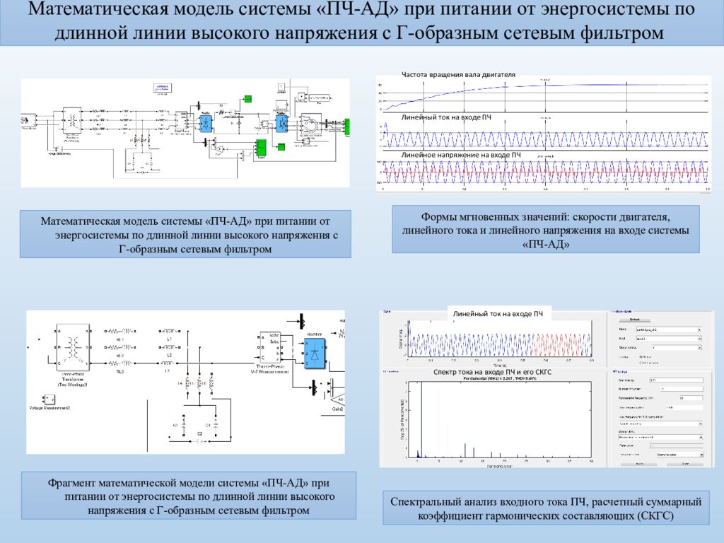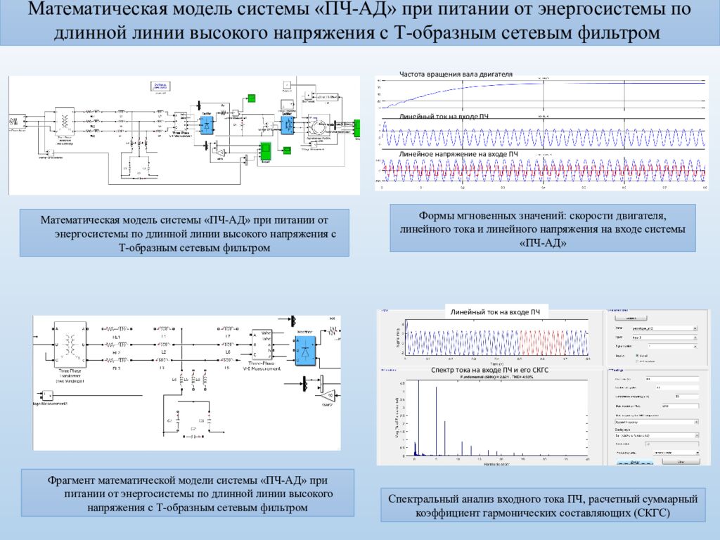 Математическая модель системы «ПЧ-АД» при питании от энергосистемы по длинной линии высокого напряжения с Т-образным сетевым фильтром Спектральный анализ входного тока ПЧ, расчетный суммарный коэффициент гармонических составляющих (СКГС) Математическая модель системы «ПЧ-АД» при питании от энергосистемы по длинной линии высокого напряжения с Т-образным сетевым фильтром Формы мгновенных значений: скорости двигателя, линейного тока и линейного напряжения на входе системы «ПЧ-АД» Частота вращения вала двигателя Линейный ток на входе ПЧ Линейное напряжение на входе ПЧ Линейный ток на входе ПЧ Спектр тока на входе ПЧ и его СКГС Фрагмент математической модели системы «ПЧ-АД» при питании от энергосистемы по длинной линии высокого напряжения с Т-образным сетевым фильтром