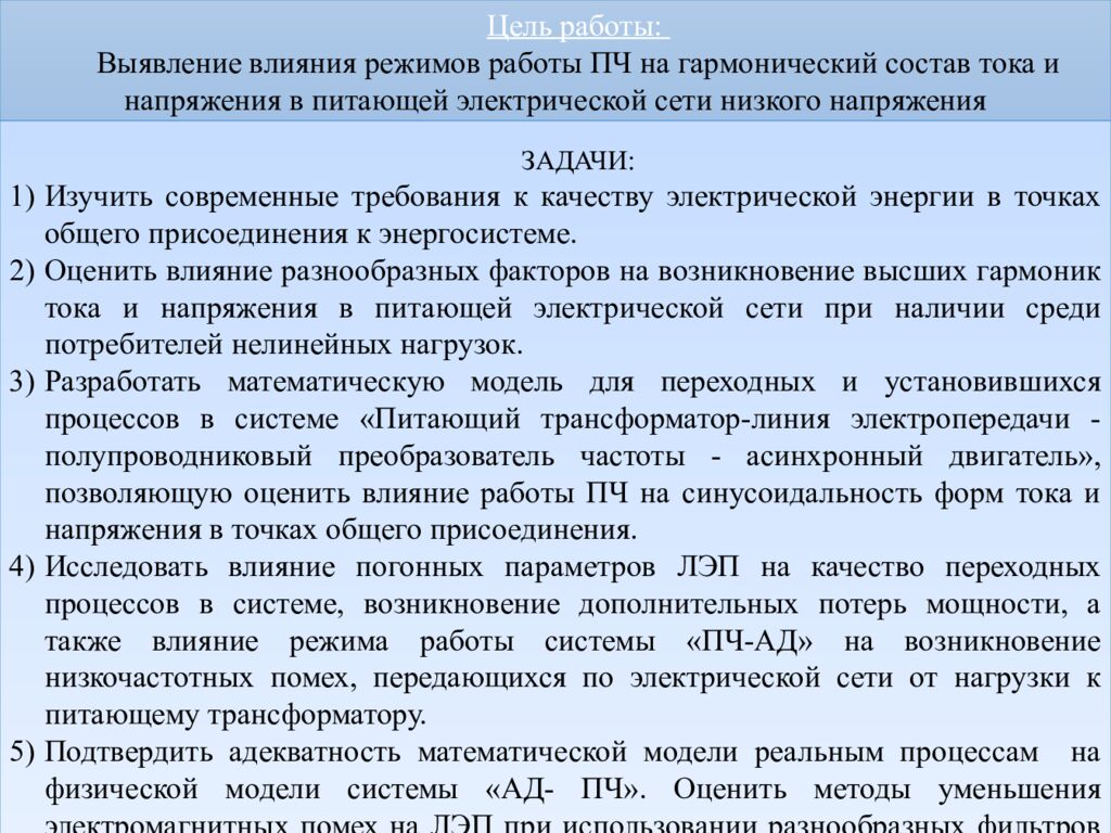 Цель работы: Выявление влияния режимов работы ПЧ на гармонический состав тока и напряжения в питающей электрической сети низкого напряжения Задачи: Изучить современные требования к качеству электрической энергии в точках общего присоединения к энергосистеме. Оценить влияние разнообразных факторов на возникновение высших гармоник тока и напряжения в питающей электрической сети при наличии среди потребителей нелинейных нагрузок. Разработать математическую модель для переходных и установившихся процессов в системе «Питающий трансформатор-линия электропередачи - полупроводниковый преобразователь частоты - асинхронный двигатель», позволяющую оценить влияние работы ПЧ на синусоидальность форм тока и напряжения в точках общего присоединения. Исследовать влияние погонных параметров ЛЭП на качество переходных процессов в системе, возникновение дополнительных потерь мощности, а также влияние режима работы системы «ПЧ-АД» на возникновение низкочастотных помех, передающихся по электрической сети от нагрузки к питающему трансформатору. Подтвердить адекватность математической модели реальным процессам на физической модели системы «АД- ПЧ». Оценить методы уменьшения электромагнитных помех на ЛЭП при использовании разнообразных фильтров напряжения и тока.