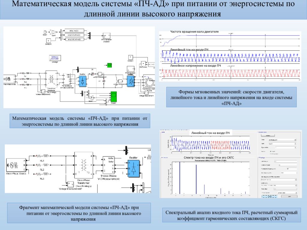 Математическая модель системы «ПЧ-АД» при питании от энергосистемы по длинной линии высокого напряжения Спектральный анализ входного тока ПЧ, расчетный суммарный коэффициент гармонических составляющих (СКГС) Математическая модель системы «ПЧ-АД» при питании от энергосистемы по длинной линии высокого напряжения Формы мгновенных значений: скорости двигателя, линейного тока и линейного напряжения на входе системы «ПЧ-АД» Частота вращения вала двигателя Линейный ток на входе ПЧ Линейное напряжение на входе ПЧ Линейный ток на входе ПЧ Спектр тока на входе ПЧ и его СКГС Фрагмент математической модели системы «ПЧ-АД» при питании от энергосистемы по длинной линии высокого напряжения