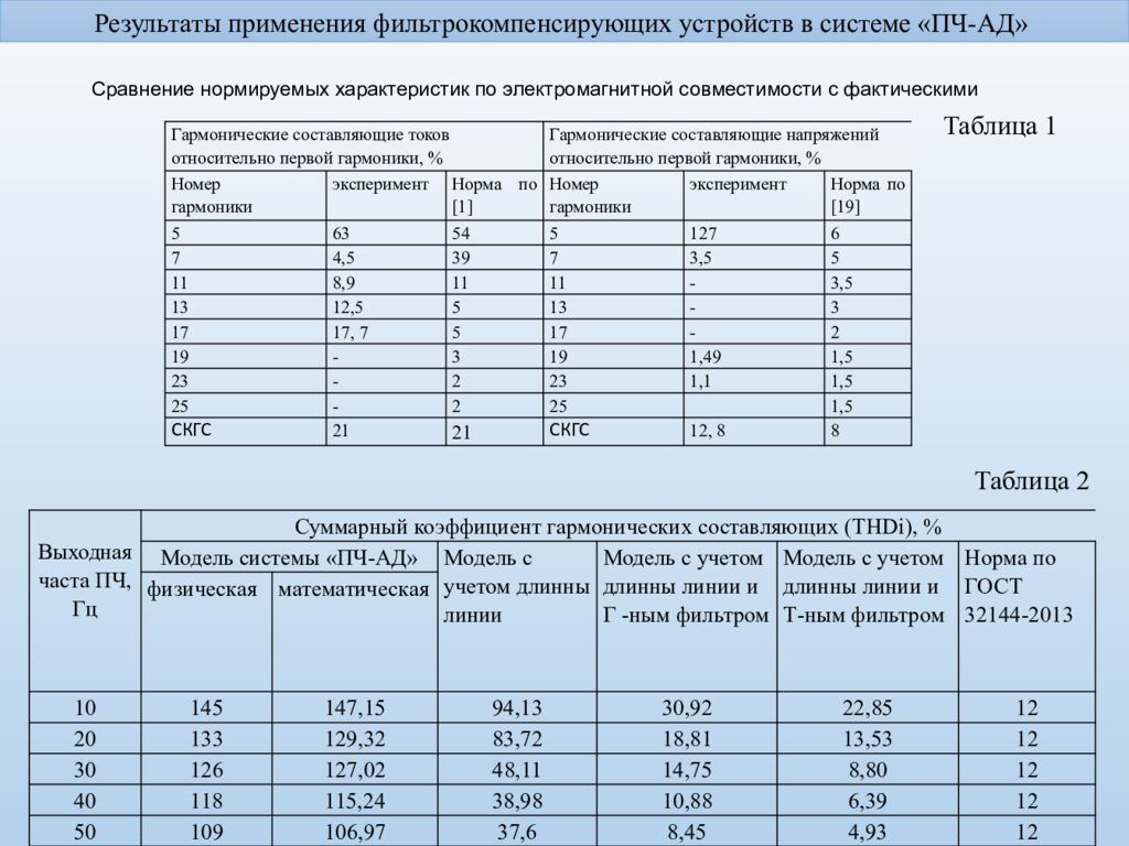 Результаты применения фильтрокомпенсирующих устройств в системе «ПЧ-АД» Выходная часта ПЧ, Гц Суммарный коэффициент гармонических составляющих ( THDi ), % Модель системы «ПЧ-АД» Модель с учетом длинны линии Модель с учетом длинны линии и Г -ным фильтром Модель с учетом длинны линии и Т-ным фильтром Норма по ГОСТ 32144-2013 физическая математическая 10 145 147,15 94,13 30,92 22,85 12 20 133 129,32 83,72 18,81 13,53 12 30 126 127, 02 48,11 14,75 8,80 12 40 118 115,24 38,98 10,88 6,39 12 50 109 1 06, 97 37,6 8,45 4,93 12 Гармонические составляющие токов относительно первой гармоники, % Гармонические составляющие напряжений относительно первой гармоники, % Номер гармоники эксперимент Норма по [ 1 ] Номер гармоники эксперимент Норма по [ 19 ] 5 63 54 5 127 6 7 4,5 39 7 3,5 5 11 8,9 11 11 - 3,5 13 12,5 5 13 - 3 17 17, 7 5 17 - 2 19 - 3 19 1,49 1,5 23 - 2 23 1,1 1,5 25 - 2 25 1,5 СКГС 21 21 СКГС 12, 8 8 Сравнение нормируемых характеристик по электромагнитной совместимости с фактическими Таблица 1 Таблица 2
