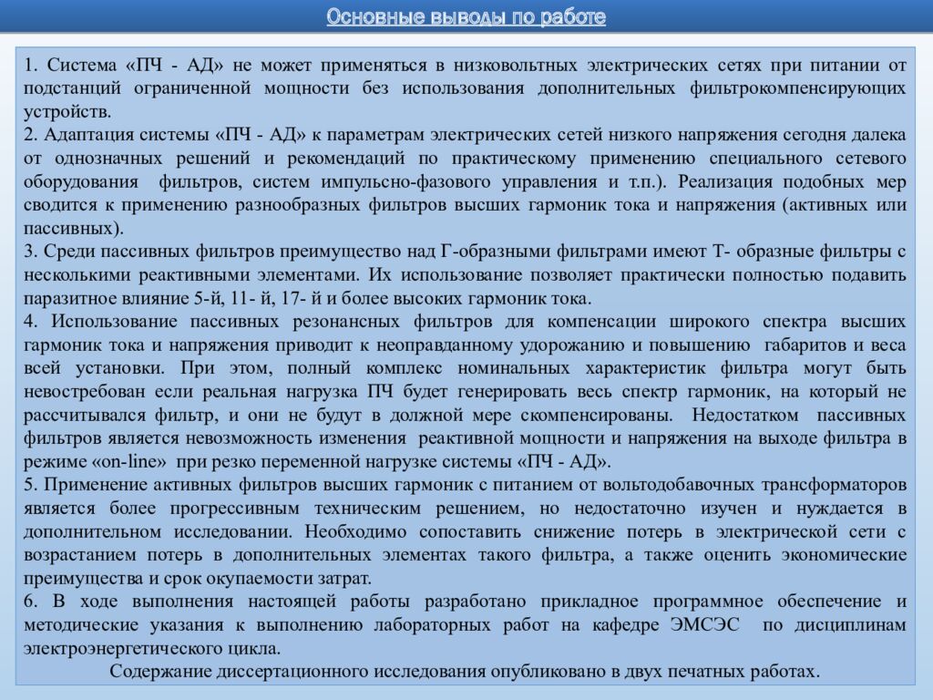 Основные выводы по работе 1. Система «ПЧ - АД» не может применяться в низковольтных электрических сетях при питании от подстанций ограниченной мощности без использования дополнительных фильтрокомпенсирующих устройств. 2. Адаптация системы «ПЧ - АД» к параметрам электрических сетей низкого напряжения сегодня далека от однозначных решений и рекомендаций по практическому применению специального сетевого оборудования фильтров, систем импульсно-фазового управления и т.п.). Реализация подобных мер сводится к применению разнообразных фильтров высших гармоник тока и напряжения (активных или пассивных). 3. Среди пассивных фильтров преимущество над Г-образными фильтрами имеют Т- образные фильтры с несколькими реактивными элементами. Их использование позволяет практически полностью подавить паразитное влияние 5-й, 11- й, 17- й и более высоких гармоник тока. 4. Использование пассивных резонансных фильтров для компенсации широкого спектра высших гармоник тока и напряжения приводит к неоправданному удорожанию и повышению габаритов и веса всей установки. При этом, полный комплекс номинальных характеристик фильтра могут быть невостребован если реальная нагрузка ПЧ будет генерировать весь спектр гармоник, на который не рассчитывался фильтр, и они не будут в должной мере скомпенсированы. Недостатком пассивных фильтров является невозможность изменения реактивной мощности и напряжения на выходе фильтра в режиме « on-line » при резко переменной нагрузке системы «ПЧ - АД». 5. Применение активных фильтров высших гармоник с питанием от вольтодобавочных трансформаторов является более прогрессивным техническим решением, но недостаточно изучен и нуждается в дополнительном исследовании. Необходимо сопоставить снижение потерь в электрической сети с возрастанием потерь в дополнительных элементах такого фильтра, а также оценить экономические преимущества и срок окупаемости затрат. 6. В ходе выполнения настоящей работы разработано прикладное программное обеспечение и методические указания к выполнению лабораторных работ на кафедре ЭМСЭС по дисциплинам электроэнергетического цикла. Содержание диссертационного исследования опубликовано в двух печатных работах.