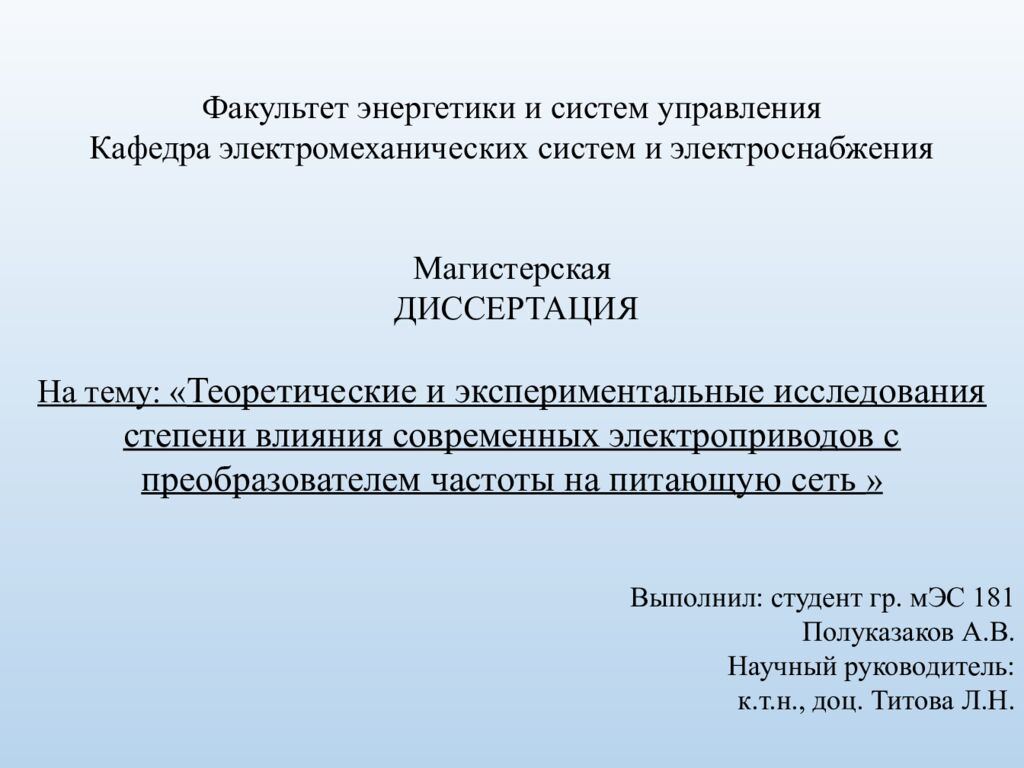 Факультет энергетики и систем управления Кафедра электромеханических систем и электроснабжения Магистерская ДИССЕРТАЦИЯ На тему: « Теоретические и экспериментальные исследования степени влияния современных электроприводов с преобразователем частоты на питающую сеть » Выполнил: студент гр. мЭС 181 Полуказаков А.В. Научный руководитель: к.т.н., доц. Титова Л.Н.