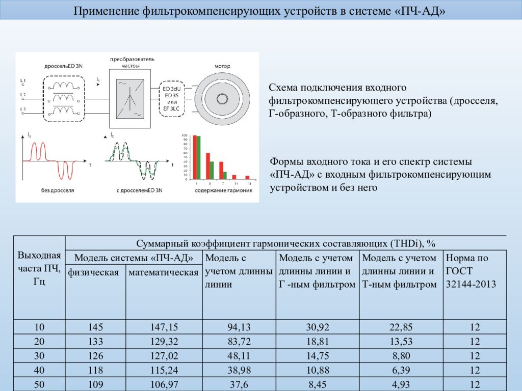 Применение фильтрокомпенсирующих устройств в системе «ПЧ-АД» Выходная часта ПЧ, Гц Суммарный коэффициент гармонических составляющих ( THDi ), % Модель системы «ПЧ-АД» Модель с учетом длинны линии Модель с учетом длинны линии и Г -ным фильтром Модель с учетом длинны линии и Т-ным фильтром Норма по ГОСТ 32144-2013 физическая математическая 10 145 147,15 94,13 30,92 22,85 12 20 133 129,32 83,72 18,81 13,53 12 30 126 127, 02 48,11 14,75 8,80 12 40 118 115,24 38,98 10,88 6,39 12 50 109 1 06, 97 37,6 8,45 4,93 12 Схема подключения входного фильтрокомпенсирующего устройства (дросселя, Г-образного, Т-образного фильтра) Формы входного тока и его спектр системы « ПЧ-АД» с входным фильтрокомпенсирующим устройством и без него