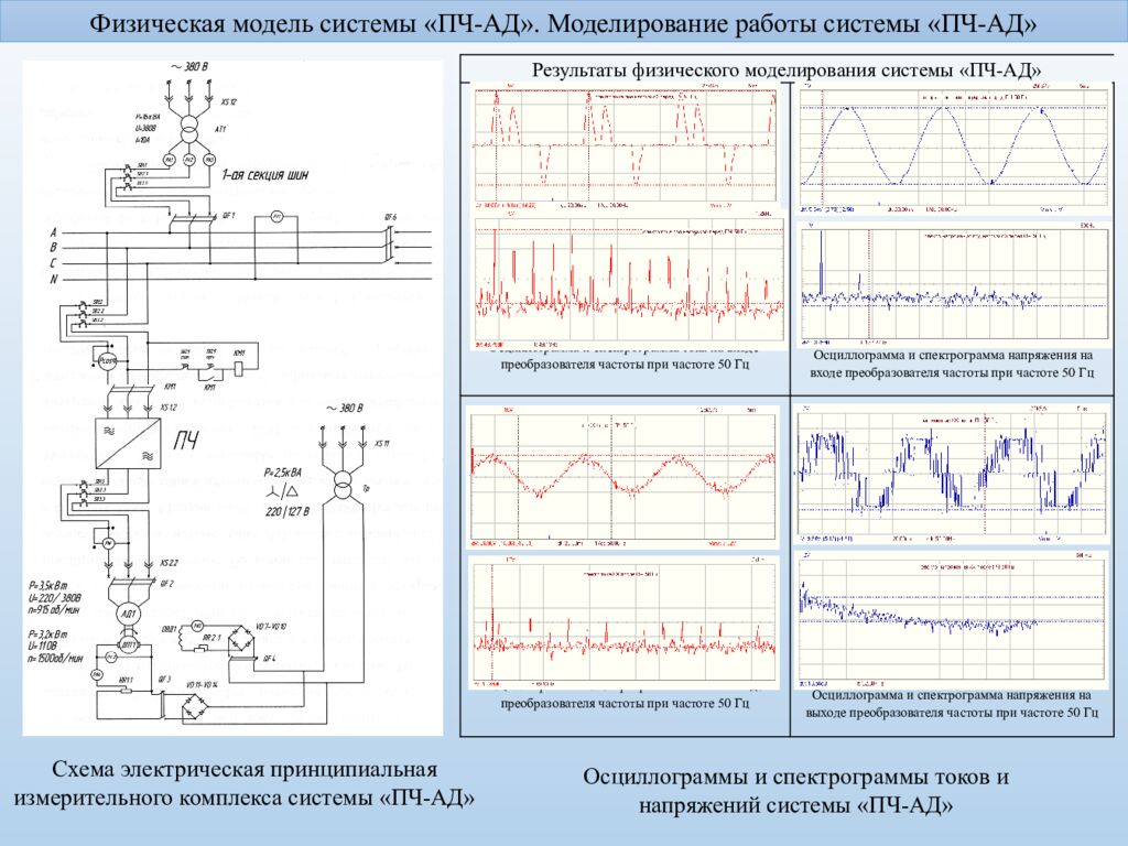 Физическая модель системы «ПЧ-АД». Моделирование работы системы «ПЧ-АД » Осциллограммы и спектрограммы токов и напряжений системы «ПЧ-АД» Схема электрическая принципиальная измерительного комплекса системы «ПЧ-АД» Результаты физического моделирования системы «ПЧ-АД» Осциллограмма и спектрограмма тока на входе преобразователя частоты при частоте 50 Гц Осциллограмма и спектрограмма напряжения на входе преобразователя частоты при частоте 50 Гц Осциллограмма и спектрограмма тока на выходе преобразователя частоты при частоте 50 Гц Осциллограмма и спектрограмма напряжения на выходе преобразователя частоты при частоте 50 Гц