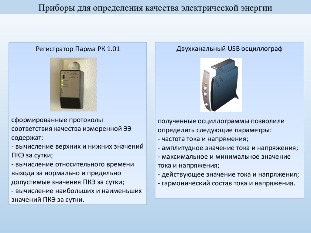 Приборы для определения качества электрической энергии Регистратор Парма РК 1.01 сформированные протоколы соответствия качества измеренной ЭЭ содержат: - вычисление верхних и нижних значений ПКЭ за сутки; - вычисление относительного времени выхода за нормально и предельно допустимые значения ПКЭ за сутки; - вычисление наибольших и наименьших значений ПКЭ за сутки. Двухканальный USB осциллограф полученные осциллограммы позволили определить следующие параметры: - частота тока и напряжения; - амплитудное значение тока и напряжения; - максимальное и минимальное значение тока и напряжения; - действующее значение тока и напряжения; - гармонический состав тока и напряжения.