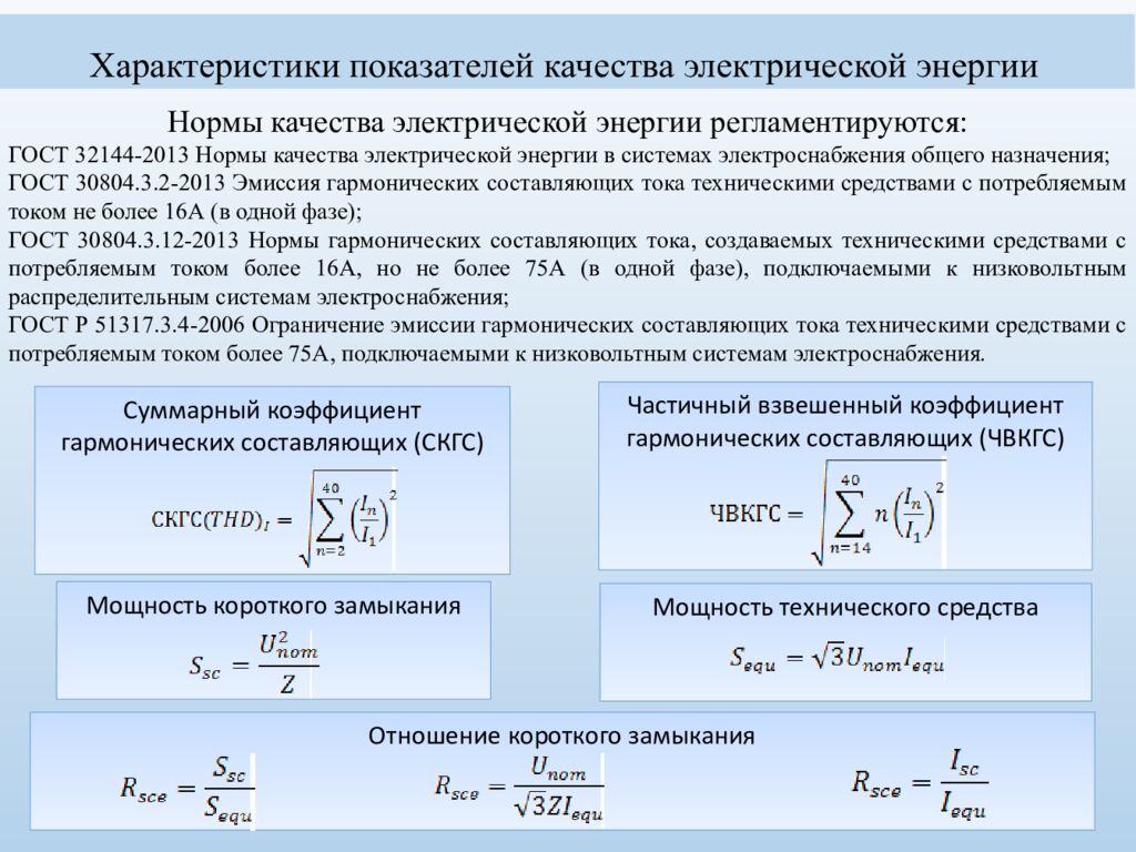 Характеристики показателей качества электрической энергии Мощность короткого замыкания Мощность технического средства Отношение короткого замыкания Нормы качества электрической энергии регламентируются: ГОСТ 32144-2013 Нормы качества электрической энергии в системах электроснабжения общего назначения; ГОСТ 30804.3.2-2013 Эмиссия гармонических составляющих тока техническими средствами с потребляемым током не более 16А (в одной фазе); ГОСТ 30804.3.12-2013 Нормы гармонических составляющих тока, создаваемых техническими средствами с потребляемым током более 16А, но не более 75А (в одной фазе), подключаемыми к низковольтным распределительным системам электроснабжения; ГОСТ Р 51317.3.4-2006 Ограничение эмиссии гармонических составляющих тока техническими средствами с потребляемым током более 75А, подключаемыми к низковольтным системам электроснабжения. Суммарный коэффициент гармонических составляющих (СКГС) Частичный взвешенный коэффициент гармонических составляющих (ЧВКГС )