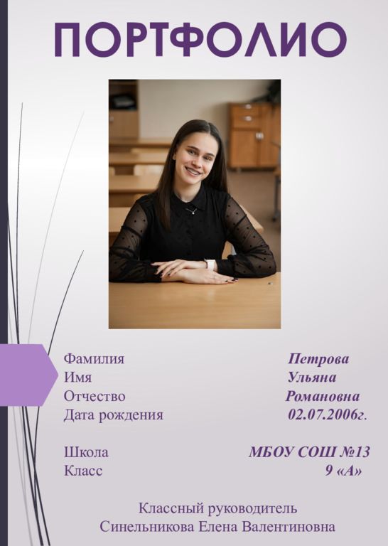 Фамилия Петрова Имя Ульяна Отчество Романовна Дата рождения 02.07.2006г. Школа МБОУ СОШ №13 Класс 9 «А» Классный руководитель Синельникова Елена Валентиновна ПОРТФОЛИО