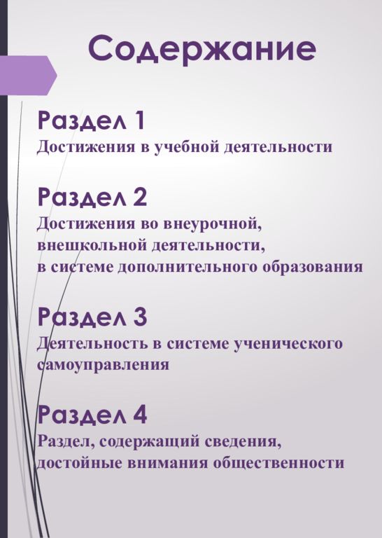 Содержание Раздел 1 Достижения в учебной деятельности Раздел 2 Достижения во внеурочной, внешкольной деятельности, в системе дополнительного образования Раздел 3 Деятельность в системе ученического самоуправления Раздел 4 Раздел, содержащий сведения, достойные внимания общественности