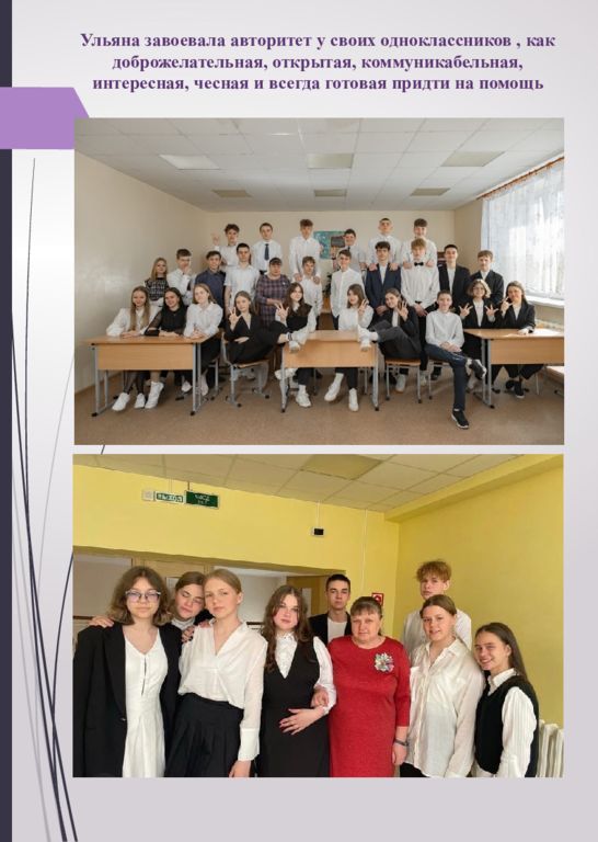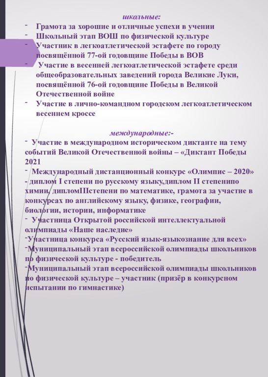 школьные : Грамота за хорошие и отличные успехи в учении Школьный этап ВОШ по физической культуре Участник в легкоатлетической эстафете по городу посвящённой 77-ой годовщине Победы в ВОВ Участие в весенней легкоатлетической эстафете среди общеобразовательных заведений города Великие Луки, посвящённой 76-ой годовщине Победы в Великой Отечественной войне Участие в лично-командном городском легкоатлетическом весеннем кроссе международные:- Участие в международном историческом диктанте на тему событий Великой Отечественной войны – «Диктант Победы 2021 Международный дистанционный конкурс « Олимпис – 2020» - диплом I степени по русскому языку,диплом II степенипо химии, диплом III степени по математике, грамота за участие в конкурсах по английскому языку, физике, географии, биологии, истории, информатике Участница Открытой российской интеллектуальной олимпиады «Наше наследие» Участница конкурса «Русский язык-языкознание для всех» Муниципальный этап всероссийской олимпиады школьников по физической культуре - победитель Муниципальный этап всероссийской олимпиады школьников по физической культуре – участник (призёр в конкурсном испытании по гимнастике)