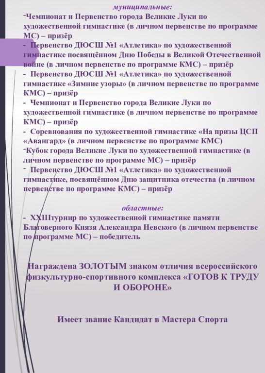 муниципальные: Чемпионат и Первенство города Великие Луки по художественной гимнастике (в личном первенстве по программе МС) – призёр - Первенство ДЮСШ №1 «Атлетика» по художественной гимнастике посвящённом Дню Победы в Великой Отечественной войне (в личном первенстве по программе КМС) – призёр - Первенство ДЮСШ №1 «Атлетика» по художественной гимнастике «Зимние узоры» (в личном первенстве по программе КМС) – призёр - Чемпионат и Первенство города Великие Луки по художественной гимнастике (в личном первенстве по программе КМС) – призёр - Соревнования по художественной гимнастике «На призы ЦСП «Авангард» (в личном первенстве по программе КМС) Кубок города Великие Луки по художественной гимнастике (в личном первенстве по программе МС) – призёр Первенство ДЮСШ №1 «Атлетика» по художественной гимнастике, посвящённом Дню защитника отечества (в личном первенстве по программе КМС) – призёр областные: - XXIII турнир по художественной гимнастике памяти Благоверного Князя Александра Невского (в личном первенстве по программе МС) – победитель Награждена ЗОЛОТЫМ знаком отличия всероссийского физкультурно-спортивного комплекса «ГОТОВ К ТРУДУ И ОБОРОНЕ» Имеет звание Кандидат в Мастера Спорта