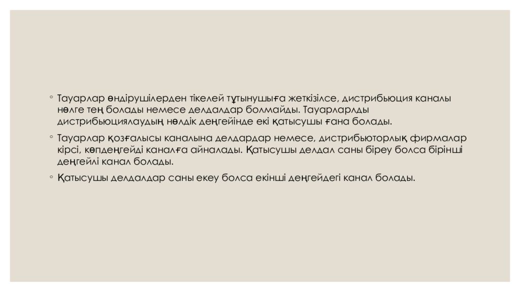 Тауарлар өндірушілерден тікелей тұтынушыға жеткізілсе, дистрибьюция каналы нөлге тең болады немесе делдалдар болмайды. Тауарларлды дистрибьюциялаудың нөлдік деңгейінде екі қатысушы ғана болады. Тауарлар қозғалысы каналына делдардар немесе, дистрибьюторлық фирмалар кірсі, көпдеңгейді каналға айналады. Қатысушы делдал саны біреу болса бірінші деңгейлі канал болады. Қатысушы делдалдар саны екеу болса екінші деңгейдегі канал болады.