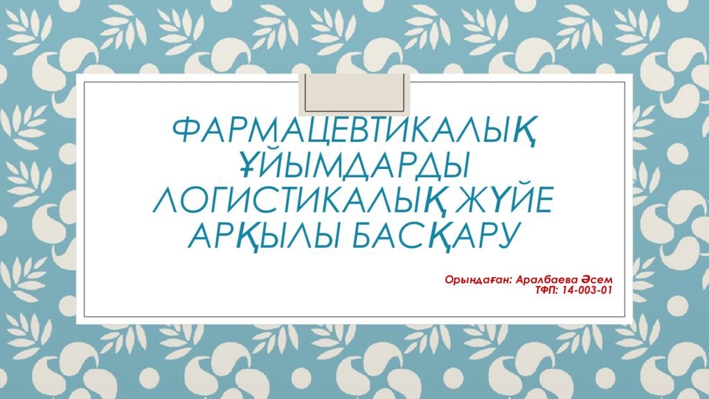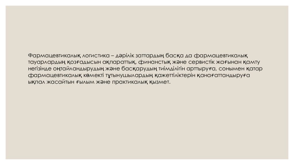 Первый слайд презентации: ФАРМАЦЕВТИКАЛЫҚ ҰЙЫМДАРДЫ ЛОГИСТИКАЛЫҚ ЖҮЙЕ АРҚЫЛЫ БАСҚАРУ