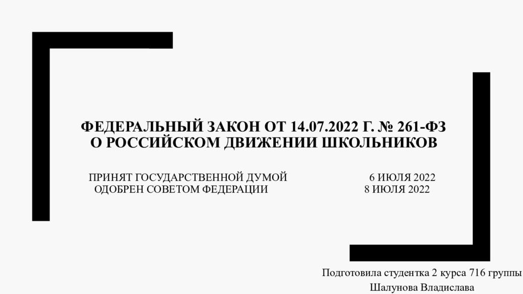 Первый слайд презентации: Федеральный закон от 14.07.2022 г. № 261-ФЗ О Российском движении школьников Принят Государственной Думой 6 июля 2022 Одобрен Советом Федерации 8 июля 2022