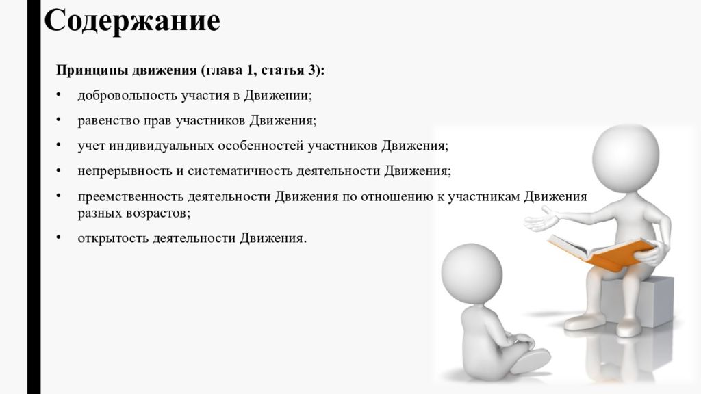 Принципы движения (глава 1, статья 3): добровольность участия в Движении; равенство прав участников Движения; учет индивидуальных особенностей участников Движения; непрерывность и систематичность деятельности Движения; преемственность деятельности Движения по отношению к участникам Движения разных возрастов; открытость деятельности Движения.