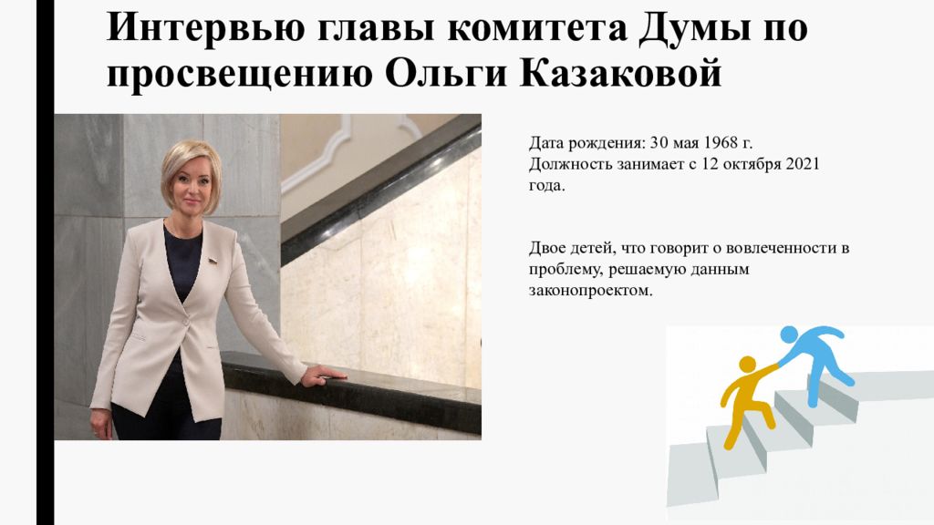 Дата рождения: 30 мая 1968 г. Должность занимает с 12 октября 2021 года. Двое детей, что говорит о вовлеченности в проблему, решаемую данным законопроектом.