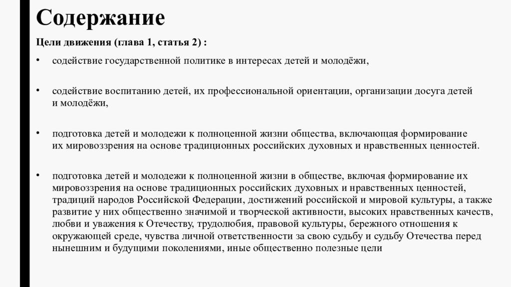Цели движения (глава 1, статья 2) : содействие государственной политике в интересах детей и молодёжи, содействие воспитанию детей, их профессиональной ориентации, организации досуга детей и молодёжи, подготовка детей и молодежи к полноценной жизни общества, включающая формирование их мировоззрения на основе традиционных российских духовных и нравственных ценностей. подготовка детей и молодежи к полноценной жизни в обществе, включая формирование их мировоззрения на основе традиционных российских духовных и нравственных ценностей, традиций народов Российской Федерации, достижений российской и мировой культуры, а также развитие у них общественно значимой и творческой активности, высоких нравственных качеств, любви и уважения к Отечеству, трудолюбия, правовой культуры, бережного отношения к окружающей среде, чувства личной ответственности за свою судьбу и судьбу Отечества перед нынешним и будущими поколениями, иные общественно полезные цели