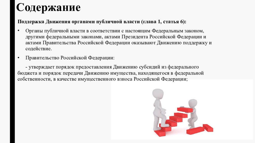 Поддержка Движения органами публичной власти (глава 1, статья 6): Органы публичной власти в соответствии с настоящим Федеральным законом, другими федеральными законами, актами Президента Российской Федерации и актами Правительства Российской Федерации оказывают Движению поддержку и содействие. Правительство Российской Федерации: - утверждает порядок предоставления Движению субсидий из федерального бюджета и порядок передачи Движению имущества, находящегося в федеральной собственности, в качестве имущественного взноса Российской Федерации;