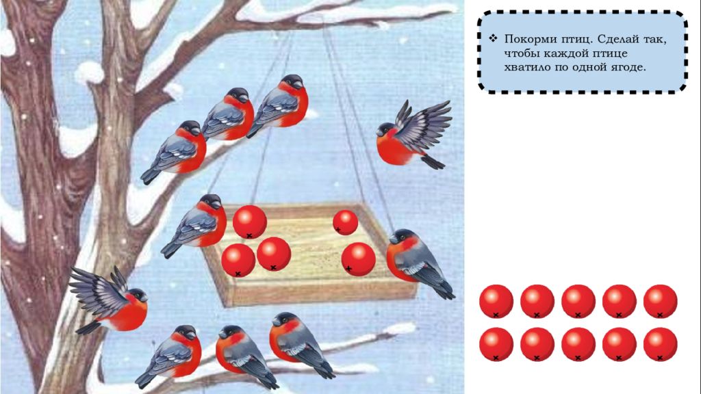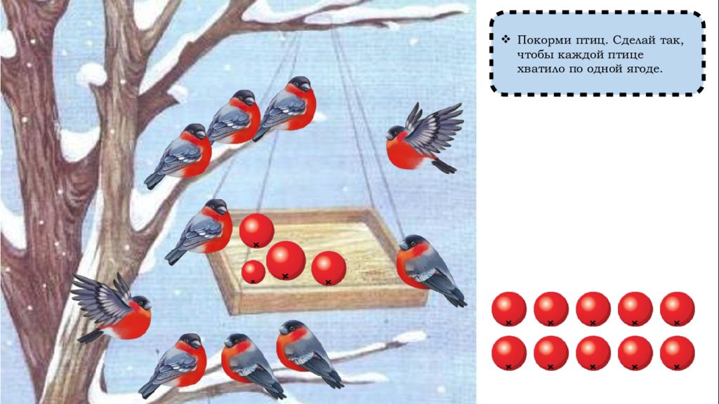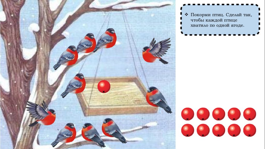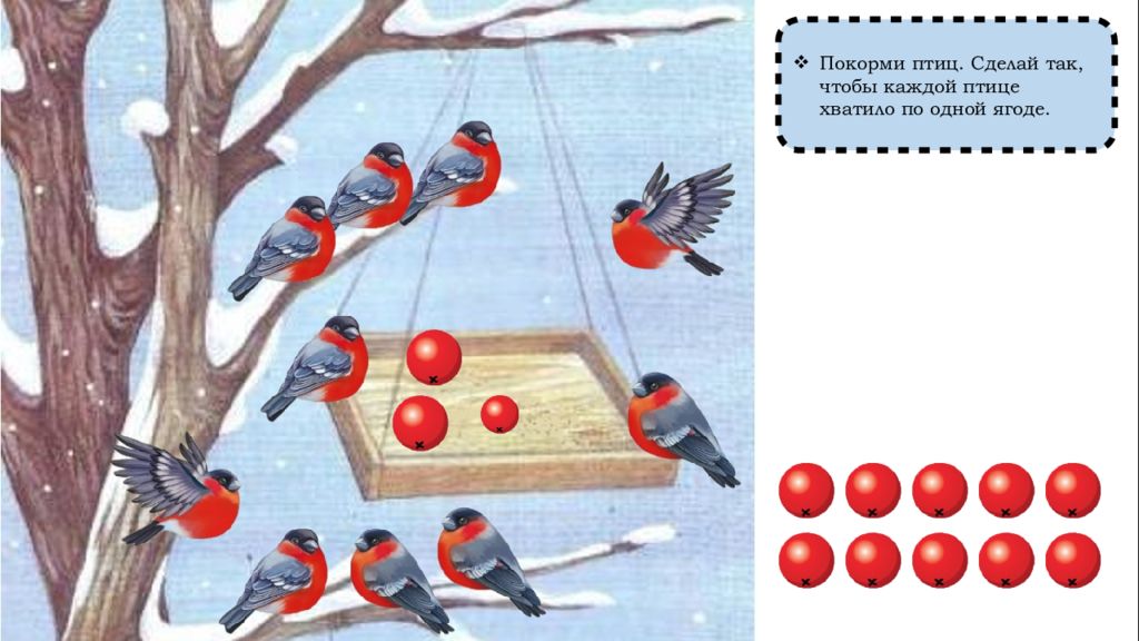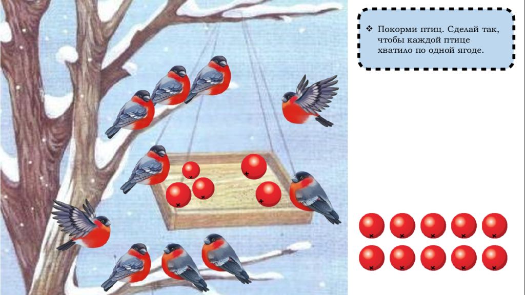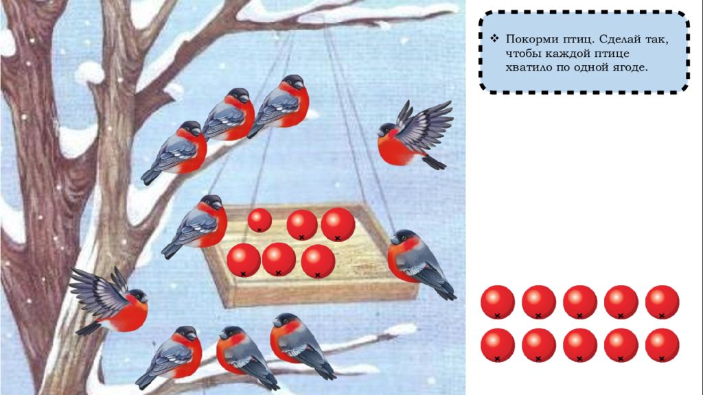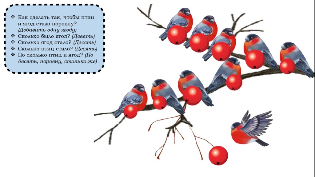 Как сделать так, чтобы птиц и ягод стало поровну? (Добавить одну ягоду) Сколько было ягод? (Девять) Сколько ягод стало? (Десять) Сколько птиц стало? (Десять) По сколько птиц и ягод? (По десять, поровну, столько же)