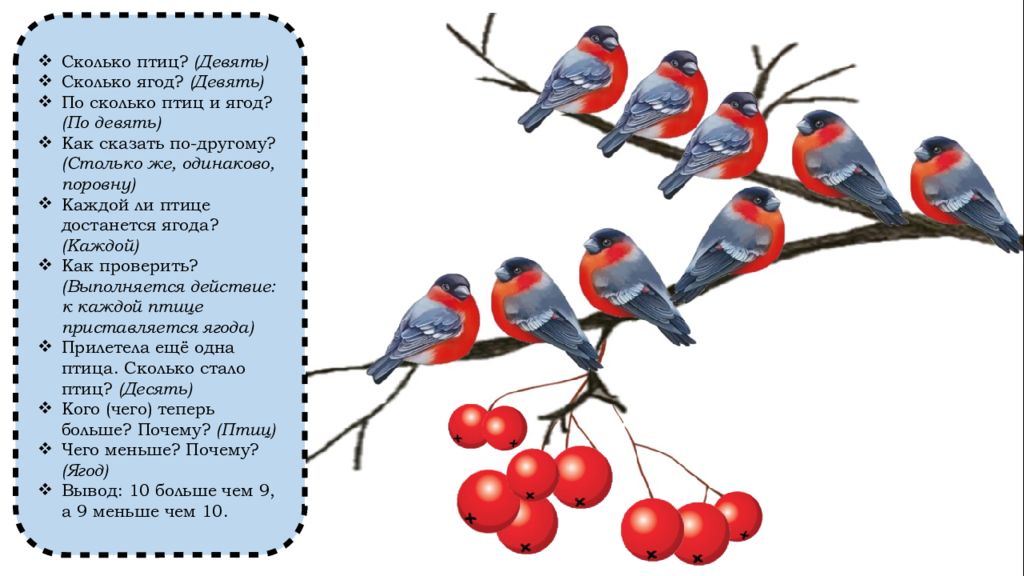 Сколько птиц? (Девять) Сколько ягод? (Девять) По сколько птиц и ягод? (По девять) Как сказать по-другому? (Столько же, одинаково, поровну) Каждой ли птице достанется ягода? (Каждой) Как проверить? (Выполняется действие: к каждой птице приставляется ягода) Прилетела ещё одна птица. Сколько стало птиц? (Десять) Кого (чего) теперь больше? Почему? (Птиц) Чего меньше? Почему? (Ягод) Вывод: 10 больше чем 9, а 9 меньше чем 10.