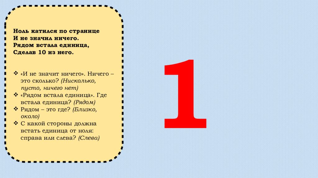 Ноль катился по странице И не значил ничего. Рядом встала единица, Сделав 10 из него. «И не значит ничего». Ничего – это сколько? (Нисколько, пусто, ничего нет) «Рядом встала единица». Где встала единица? (Рядом) Рядом – это где? (Близко, около) С какой стороны должна встать единица от ноля: справа или слева? (Слева) 0 1