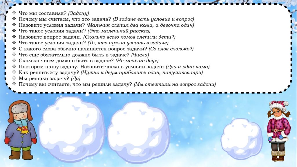 Что мы составили? (Задачу) Почему мы считаем, что это задача? (В задаче есть условие и вопрос) Назовите условия задачи? (Мальчик слепил два кома, а девочка один) Что такое условия задачи? (Это маленький рассказ) Назовите вопрос задачи. (Сколько всего комов слепили дети?) Что такое условия задачи? (То, что нужно узнать в задаче) С какого слова обычно начинается вопрос задачи? (Со слов сколько?) Что еще обязательно должно быть в задаче? (Числа) Сколько чисел должно быть в задаче? (Не меньше двух) Повторим нашу задачу. Назовите числа в условии задачи (Два и один кома) Как решить эту задачу? (Нужно к двум прибавить один, получится три) Мы решили задачу? (Да) Почему вы считаете, что мы решили задачу? (Мы ответили на вопрос задачи)