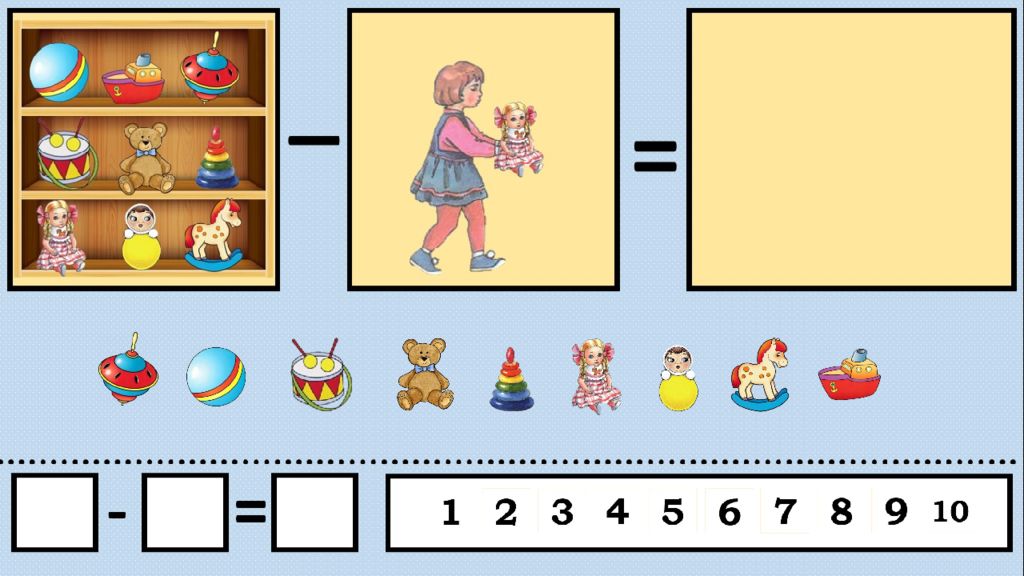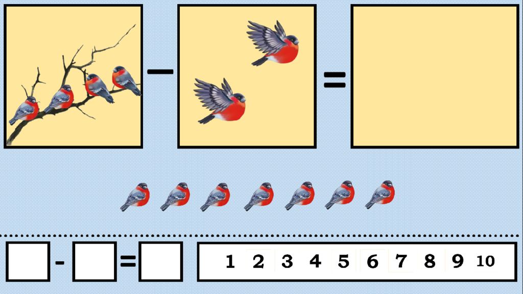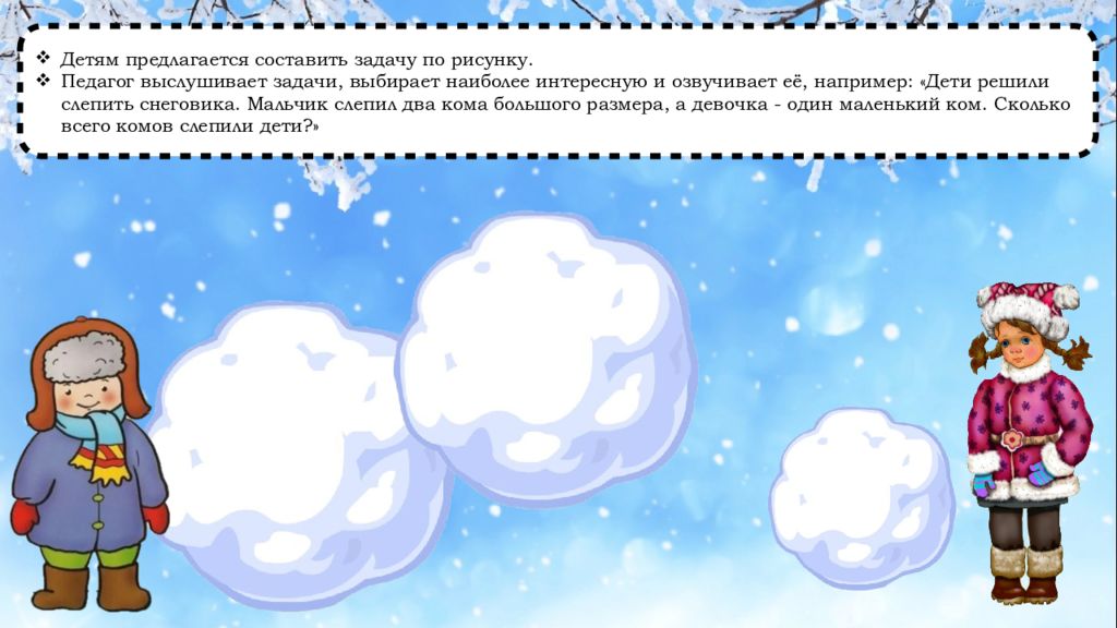 Детям предлагается составить задачу по рисунку. Педагог выслушивает задачи, выбирает наиболее интересную и озвучивает её, например: «Дети решили слепить снеговика. Мальчик слепил два кома большого размера, а девочка - один маленький ком. Сколько всего комов слепили дети?»