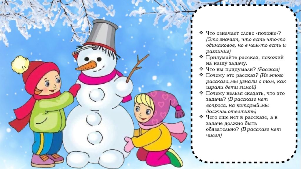 Что означает слово «похоже»? (Это значит, что есть что-то одинаковое, но в чем-то есть и различие) Придумайте рассказ, похожий на нашу задачу. Что вы придумали? (Рассказ) Почему это рассказ? (Из этого рассказа мы узнали о том, как играли дети зимой) Почему нельзя сказать, что это задача? (В рассказе нет вопроса, на который мы должны ответить) Чего еще нет в рассказе, а в задаче должно быть обязательно? (В рассказе нет чисел)