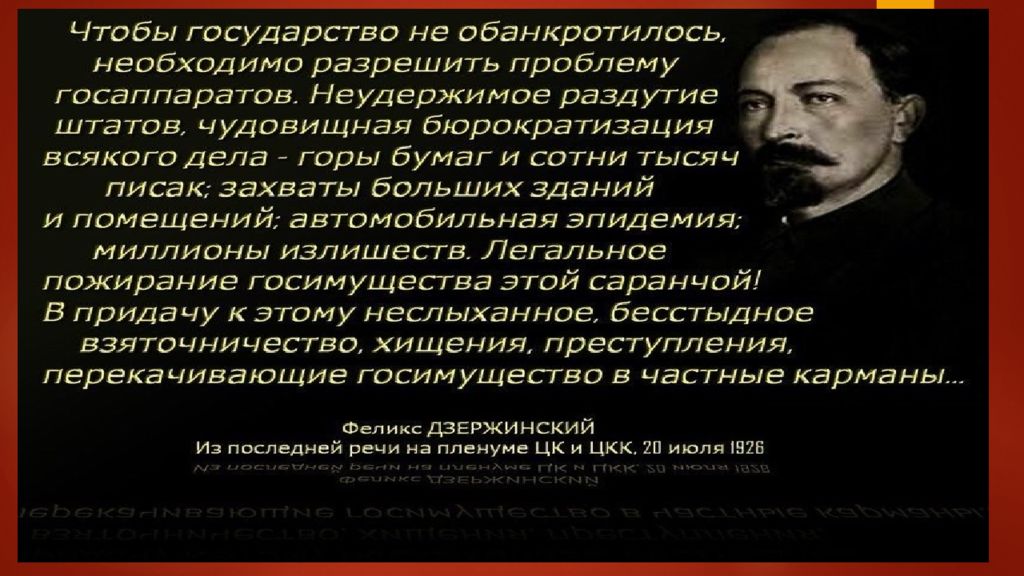 Феликс Дзержинский активно принимал участие в строительстве государства нового типа, вел непрерывную полемику с другими членами партии выражал в несогласие с экономической политикой правительства в 1925-1926 годах, в связи с чем просил об отставке. Оспаривал мнение о приоритете государства и, в частности, армии в качестве базы развития металлопромышленности. Считал необходимым радикально изменить систему управления, чтобы преодолеть бюрократический «паралич жизни», полагая, что в противном случае страна «найдёт своего диктатора, похоронщика революции, — какие бы красные перья ни были на его костюме». 20 июля 1926 года на пленуме ЦК, посвящённом состоянию экономики СССР, Дзержинский произнёс двухчасовой доклад. После этого ему стало плохо. В тот же день он скончался от сердечного приступа.