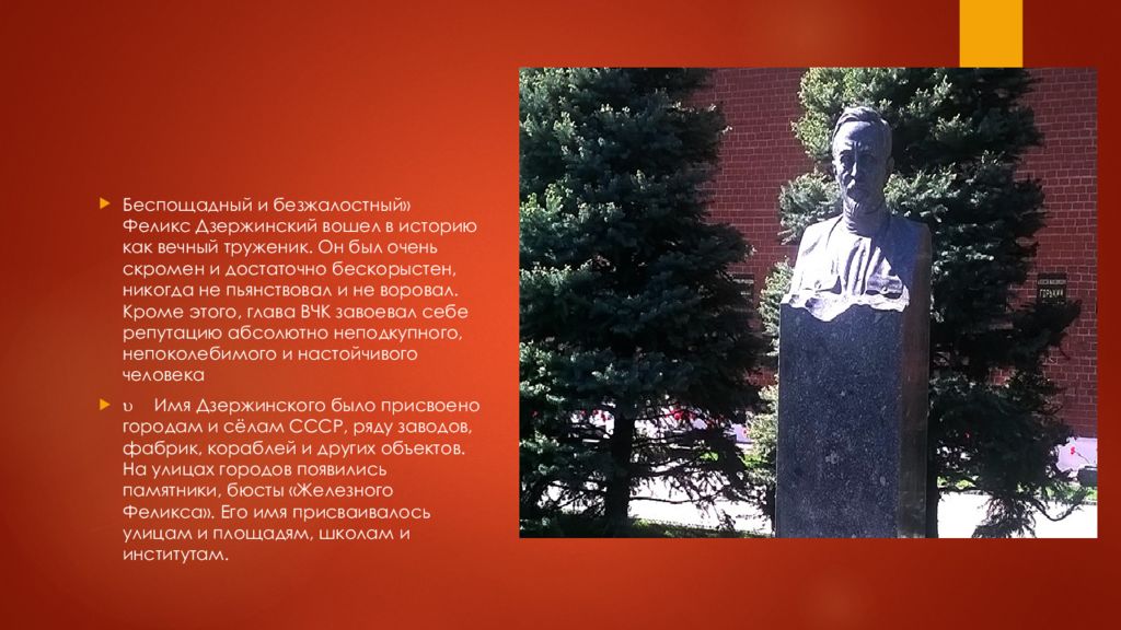 Беспощадный и безжалостный» Феликс Дзержинский вошел в историю как вечный труженик. Он был очень скромен и достаточно бескорыстен, никогда не пьянствовал и не воровал. Кроме этого, глава ВЧК завоевал себе репутацию абсолютно неподкупного, непоколебимого и настойчивого человека Имя Дзержинского было присвоено городам и сёлам СССР, ряду заводов, фабрик, кораблей и других объектов. На улицах городов появились памятники, бюсты «Железного Феликса». Его имя присваивалось улицам и площадям, школам и институтам.