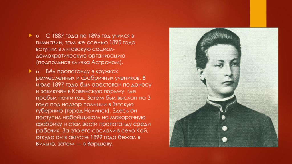 С 1887 года по 1895 год учился в гимназии, там же осенью 1895 года вступил в литовскую социал-демократическую организацию (подпольная кличка Астроном). Вёл пропаганду в кружках ремесленных и фабричных учеников. В июле 1897 года был арестован по доносу и заключён в Ковенскую тюрьму, где пробыл почти год. Затем был выслан на 3 года под надзор полиции в Вятскую губернию (город Нолинск). Здесь он поступил набойщиком на махорочную фабрику и стал вести пропаганду среди рабочих. За это его сослали в село Кай, откуда он в августе 1899 года бежал в Вильно, затем — в Варшаву.