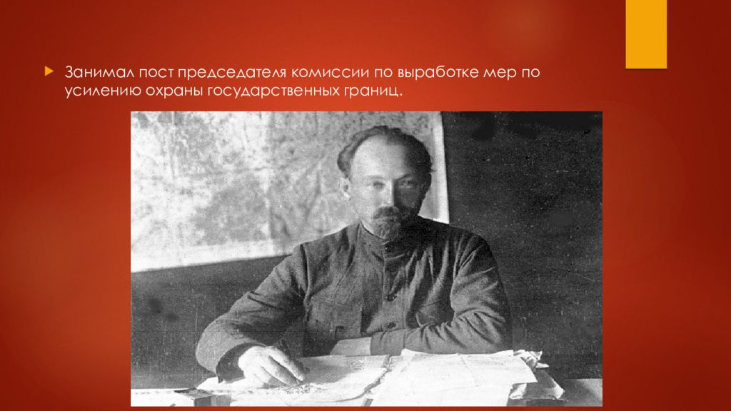 Занимал пост председателя комиссии по выработке мер по усилению охраны государственных границ.