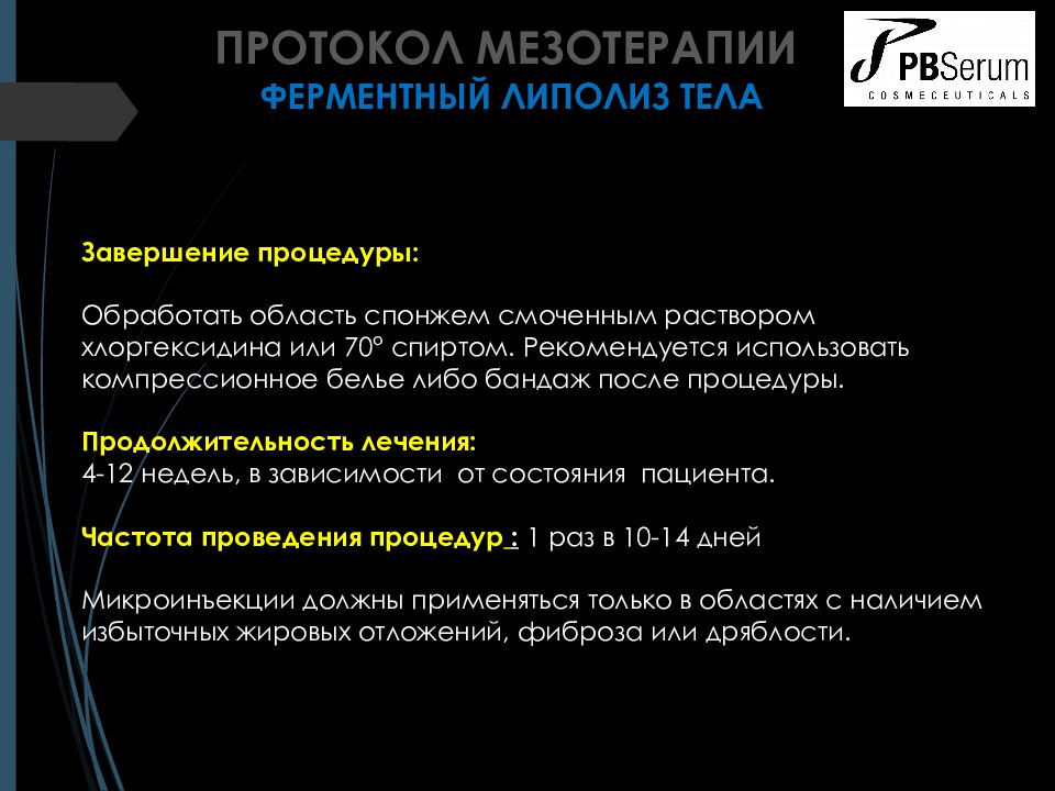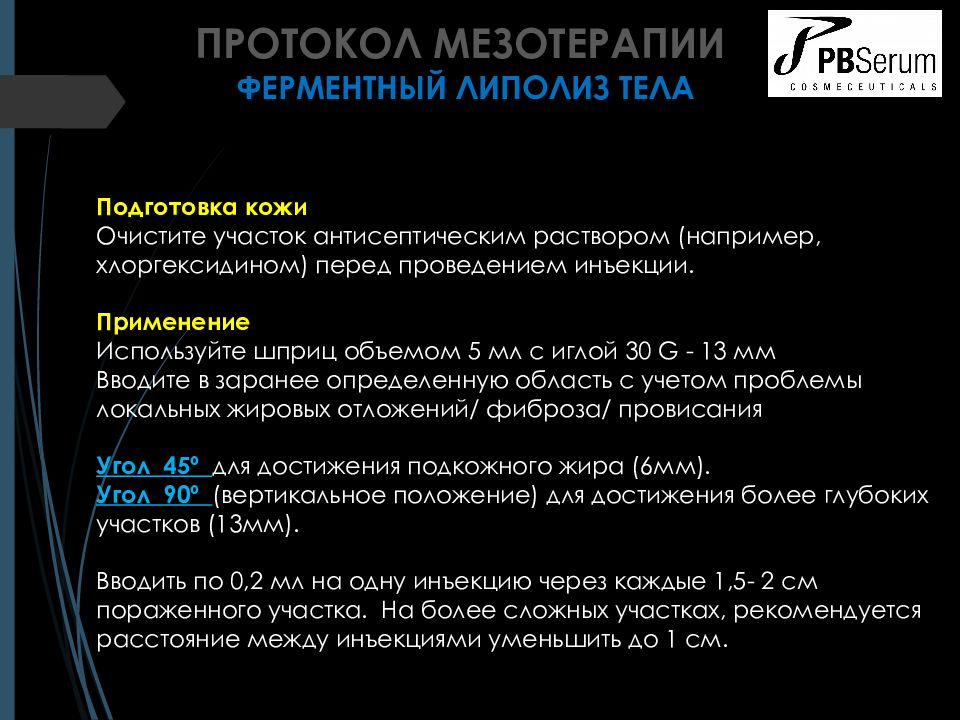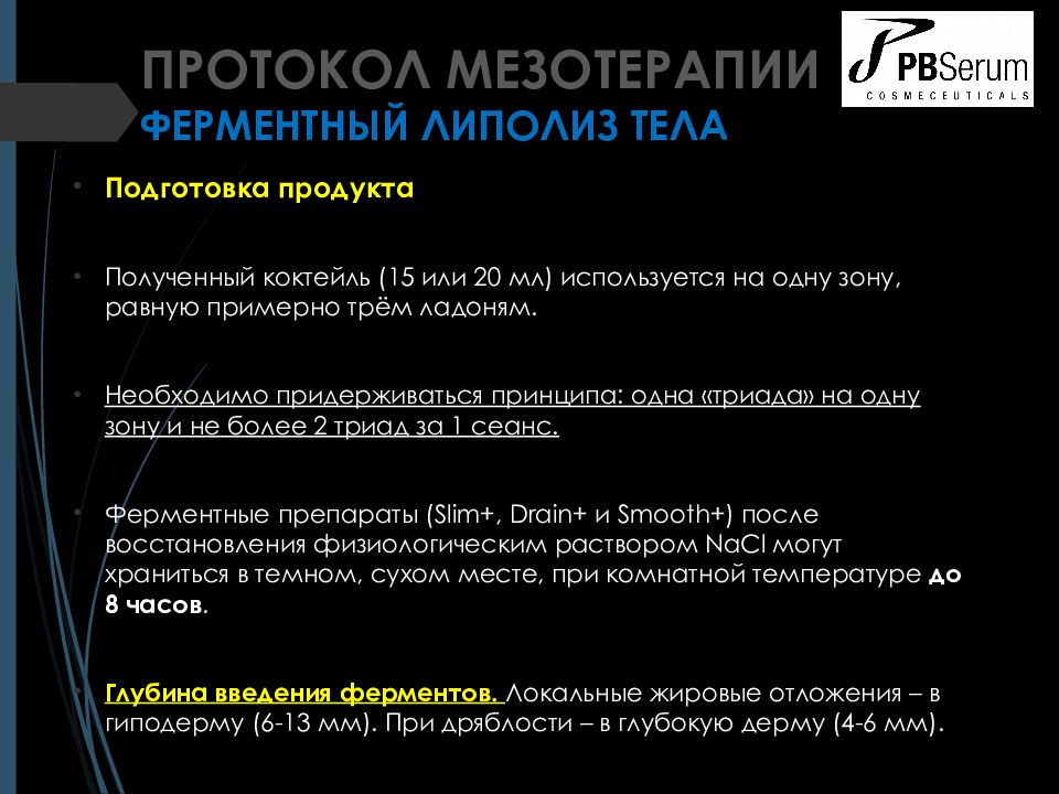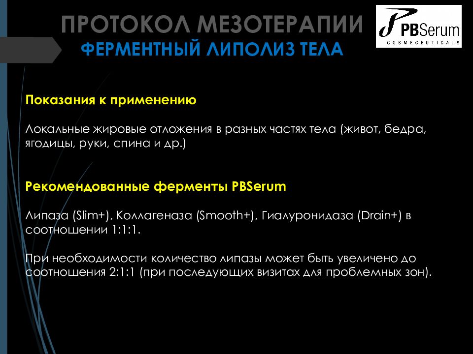 ПРОТОКОЛ МЕЗОТЕРАПИИ ФЕРМЕНТНЫЙ ЛИПОЛИЗ ТЕЛА Показания к применению Локальные жировые отложения в разных частях тела ( живот, бедра, ягодицы, руки, спина и др.) Рекомендованные ферменты PBSerum Липаза ( Slim +), Коллагеназа ( Smooth +), Гиалуронидаза ( Drain +) в соотношении 1:1:1. При необходимости количество липазы может быть увеличено до соотношения 2:1:1 (при последующих визитах для проблемн ых зон).