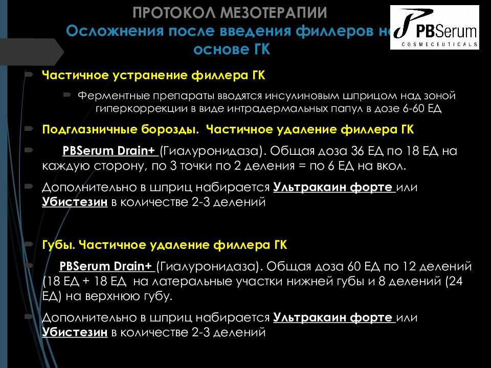 Частичное устранение филлера ГК Ферментные препараты вводятся инсулиновым шприцом над зоной гиперкоррекции в виде интрадермальных папул в дозе 6-60 ЕД Подглазничные борозды. Частичное удаление филлера ГК PBSerum Drain+ ( Гиалуронидаза ). Общая доза 36 ЕД по 18 ЕД на каждую сторону, по 3 точки по 2 деления = по 6 ЕД на вкол. Дополнительно в шприц набирается Ультракаин форте или У бистезин в количестве 2-3 делений Губы. Частичное удаление филлера ГК PBSerum Drain+ ( Гиалуронидаза ). Общая доза 60 ЕД по 12 делений (18 ЕД + 18 ЕД на латеральные участки нижней губы и 8 делений (24 ЕД) на верхнюю губу. Дополнительно в шприц набирается Ультракаин форте или Убистезин в количестве 2-3 делений