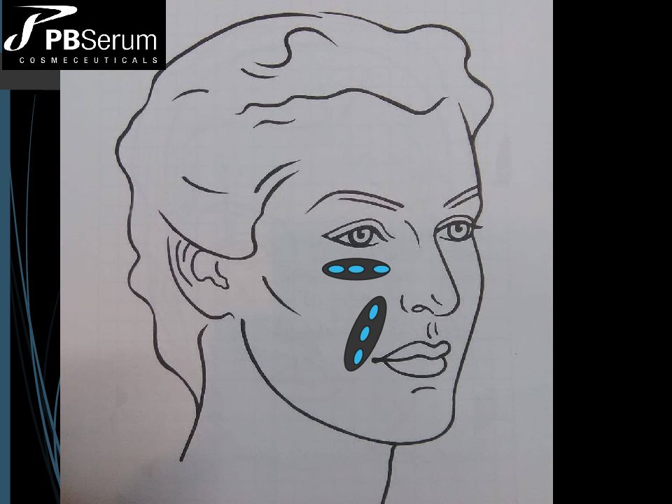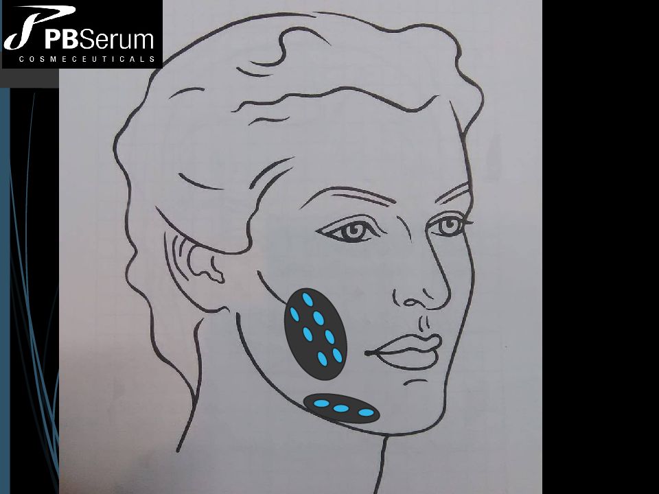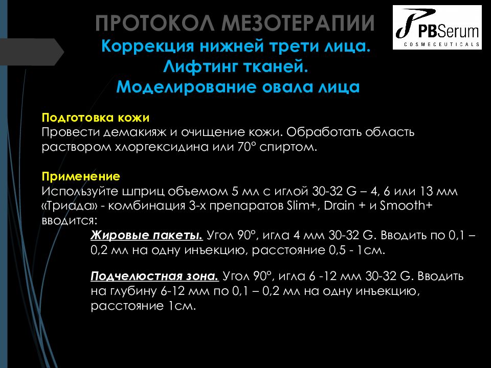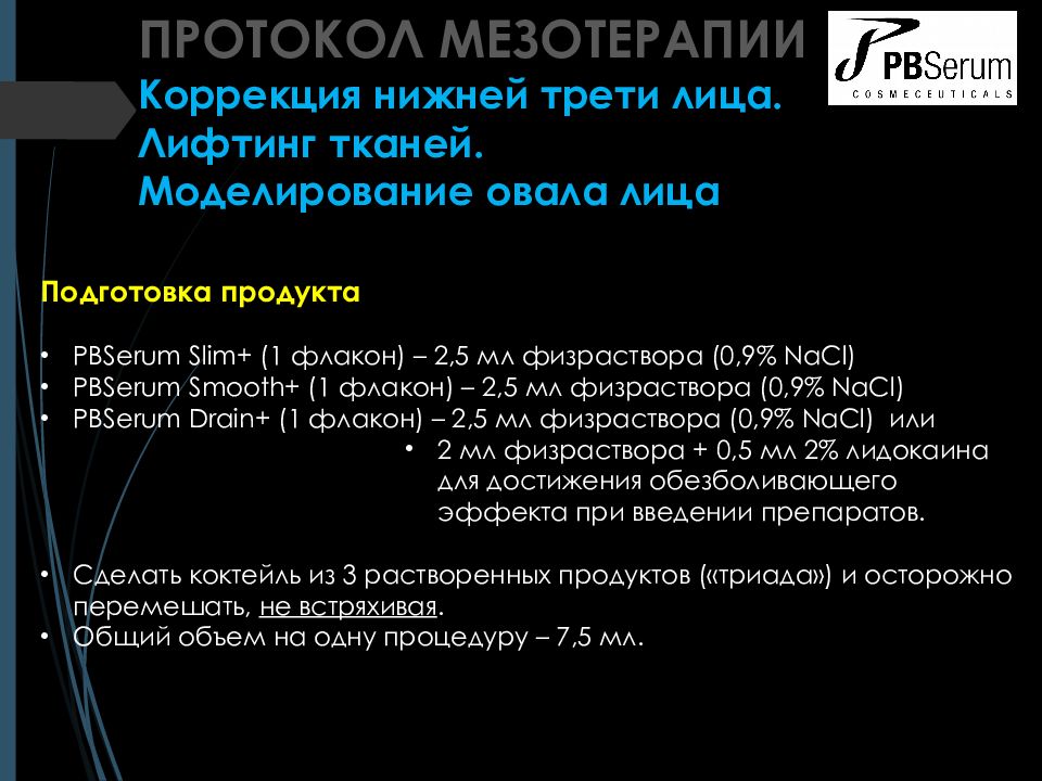 Подготовка продукта PBSerum Slim + (1 флакон) – 2, 5 мл физраствора (0,9% NaCl ) PBSerum Smooth + (1 флакон ) – 2,5 мл физраствора (0,9% NaCl ) PBSerum Drain + (1 флакон ) – 2, 5 мл физраствора (0,9% NaCl ) или 2 мл физраствора + 0,5 мл 2% лидокаина для достижения обезболивающего эффекта при введении препаратов. Сделать коктейль из 3 растворенных продуктов («триада») и осторожно перемешать, не встрях ивая. Общий объем на одну процедуру – 7,5 мл. ПРОТОКОЛ МЕЗОТЕРАПИИ Коррекция нижней трети лица. Лифтинг тканей. Моделирование овала лица