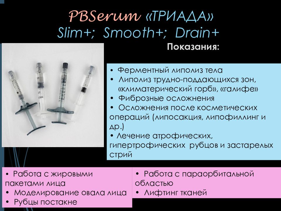 PBSerum «ТРИАДА» Slim+ ; Smooth+ ; Drain+ Показания: • Ферментный липолиз тела • Липолиз трудно-поддающихся зон, « климатерический горб», «галифе » • Фиброзные осложнения • Осложнения после косметических операций (липосакция, липофиллинг и др.) • Лечение атрофических, гипертрофических рубцов и застарелых стрий • Работа с жировыми пакетами лица • Моделирование овала лица • Рубцы постакне • Работа с параорбитальной областью • Лифтинг тканей