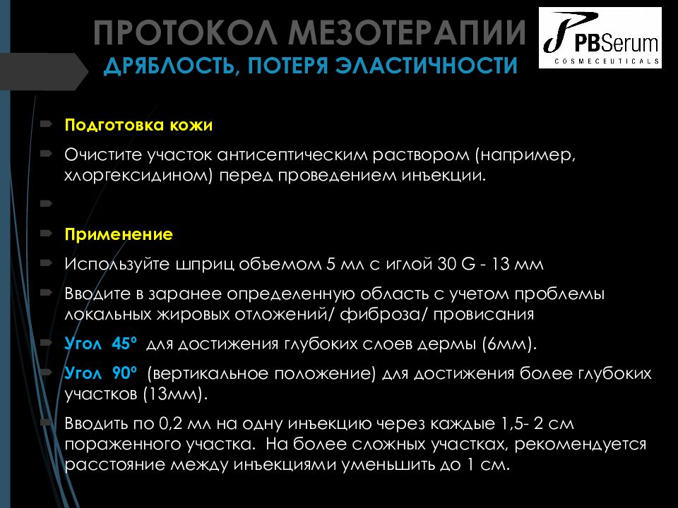 Подготовка кожи Очистите участок антисептическим раствором ( например, хлоргексидином ) перед проведением инъекции. Применение Используйте шприц объемом 5 мл с иглой 30 G - 13 мм Вводите в заранее определенную область с учетом проблемы локальных жировых отложений / фиброза / провисания Угол 45º для достижения глубоких слоев дермы (6мм). Угол 90º ( вертикальное положение ) для достижения более глубоких участков (13мм). Вводить по 0,2 мл на одну инъекцию через каждые 1,5- 2 см пораженного участка. На более сложных участках, рекомендуется расстояние между инъекциями уменьшить до 1 см. ПРОТОКОЛ МЕЗОТЕРАПИИ ДРЯБЛОСТЬ, ПОТЕРЯ ЭЛАСТИЧНОСТИ