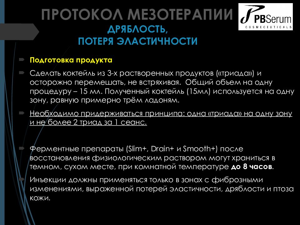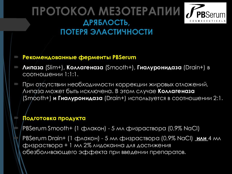 Рекомендованные ферменты PBSerum Липаза ( Slim +), Коллагеназа ( Smooth +), Гиалуронидаза ( Drain +) в соотношении 1:1:1. При отсутствии необходимости коррекции жировых отложений, Липаза может быть исключена. В этом случае Коллагеназ а ( Smooth +) и Гиалуронидаза ( Drain +) используется в соотношении 2:1. Подготовка продукта PBSerum Smooth + (1 флакон ) - 5 мл физраствора (0,9% NaCl ) PBSerum Drain + (1 флакон ) - 5 мл физраствора (0,9% NaCl ) или 4 мл физраствора + 1 мл 2% лидокаина для достижения обезболивающего эффекта при введении препаратов. ПРОТОКОЛ МЕЗОТЕРАПИИ ДРЯБЛОСТЬ, ПОТЕРЯ ЭЛАСТИЧНОСТИ