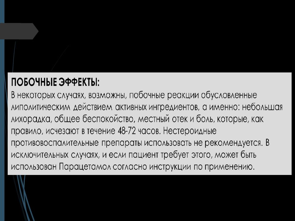 Завершение процедуры: Обработать область спонжем смоченным раствором хлоргексидина или 70° спиртом. Рекомендуется использовать компрессионное белье либо бандаж после процедуры. Продолжительность лечения : 4-12 недель, в зависимости от состояния пациента. Частота проведения процедур : 1 раз в 10-14 дней Микроинъекции должны применяться только в областях с наличием избыточных жировых отложений, фиброза или дряблости.