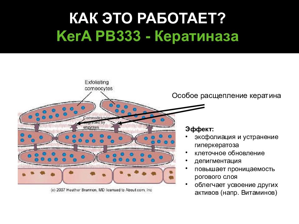 Особое расщепление кератина Эффект : эксфолиация и устранение гиперкератоза клеточное обновление д епигментация повышает проницаемость рогового слоя о блегчает усвоение других активов (напр. Витаминов) КАК ЭТО РАБОТАЕТ ? KerA PB333 - Кератиназа