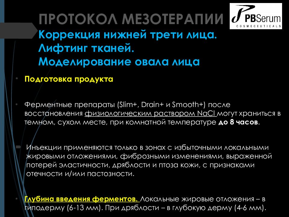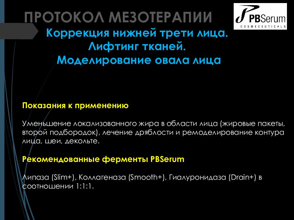 ПРОТОКОЛ МЕЗОТЕРАПИИ Коррекция нижней трети лица. Лифтинг тканей. Моделирование овала лица Показания к применению Уменьшение локализованного жира в области лица ( жировые пакеты, второй подбородок ), лечение дряблости и ремоделирование контура лица, шеи, декольте. Рекомендованные ферменты PBSerum Липаза ( Slim +), Коллагеназа ( Smooth +), Гиалуронидаза ( Drain +) в соотношении 1:1:1.