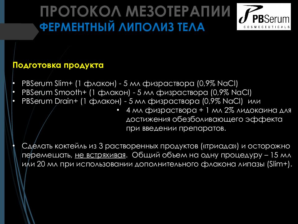 Подготовка продукта PBSerum Slim + (1 флакон) - 5 мл физраствора (0,9% NaCl ) PBSerum Smooth + (1 флакон ) - 5 мл физраствора (0,9% NaCl ) PBSerum Drain + (1 флакон ) - 5 мл физраствора (0,9% NaCl ) или 4 мл физраствора + 1 мл 2% лидокаина для достижения обезболивающего эффекта при введении препаратов. Сделать коктейль из 3 растворенных продуктов («триада») и осторожно перемешать, не встрях ивая. Общий объем на одну процедуру – 15 мл или 20 мл при использовании дополнительного флакона липазы ( Slim + ). ПРОТОКОЛ МЕЗОТЕРАПИИ ФЕРМЕНТНЫЙ ЛИПОЛИЗ ТЕЛА