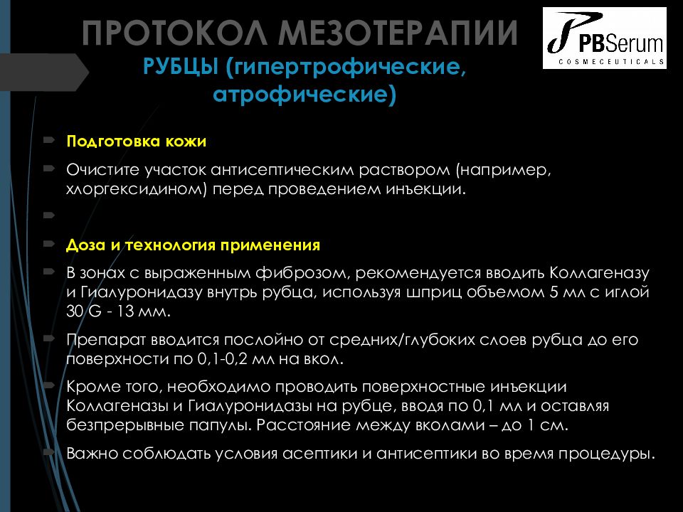 Подготовка кожи Очистите участок антисептическим раствором ( например, хлоргексидином ) перед проведением инъекции. Доза и технология применения В зонах с выраженным фиброзом, рекомендуется вводить Коллагеназу и Гиалуронидазу внутрь рубца, используя шприц объемом 5 мл с иглой 30 G - 13 мм. Препарат вводится послойно от средних / глубоких слоев рубца до его поверхности по 0,1-0,2 мл на вкол. Кроме того, необходимо проводить поверхностные инъекции Коллагеназы и Гиалуронидазы на рубце, вводя по 0,1 мл и оставляя безпрерывные папулы. Расстояние между вколами – до 1 см. Важно соблюдать условия асептики и антисептики во время процедуры. ПРОТОКОЛ МЕЗОТЕРАПИИ РУБЦЫ (г ипертрофические, атрофические)