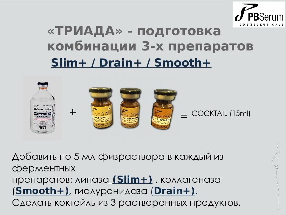 «ТРИАДА» - подготовка комбинации 3-х препаратов Добавить по 5 мл физраствора в каждый из ферментных препаратов: липаза ( Slim+ ), коллагеназа ( Smooth+ ), гиалуронидаза ( Drain+ ). Сделать коктейль из 3 растворенных продуктов. + = COCKTAIL (15ml) Slim+ / Drain+ / Smooth+