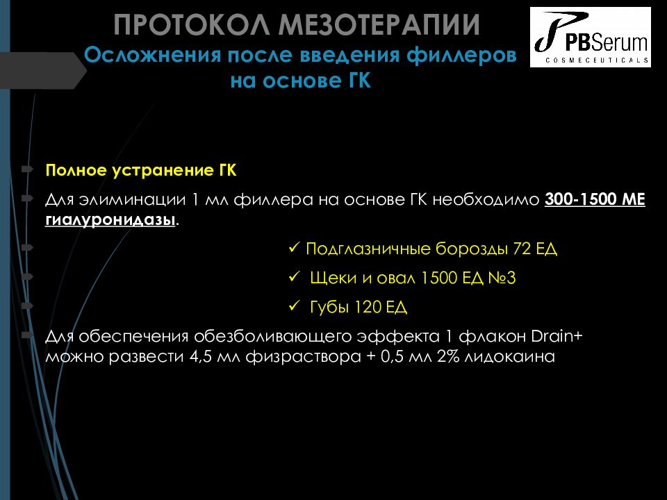 Полное устранение ГК Для элиминации 1 мл филлера на основе ГК необходимо 300-1500 МЕ гиалуронидазы. Подглазничные борозды 72 ЕД Щеки и овал 1500 ЕД №3 Губы 120 ЕД Для обеспечения обезболивающего эффекта 1 флакон Drain+ можно развести 4,5 мл физраствора + 0,5 мл 2% лидокаина