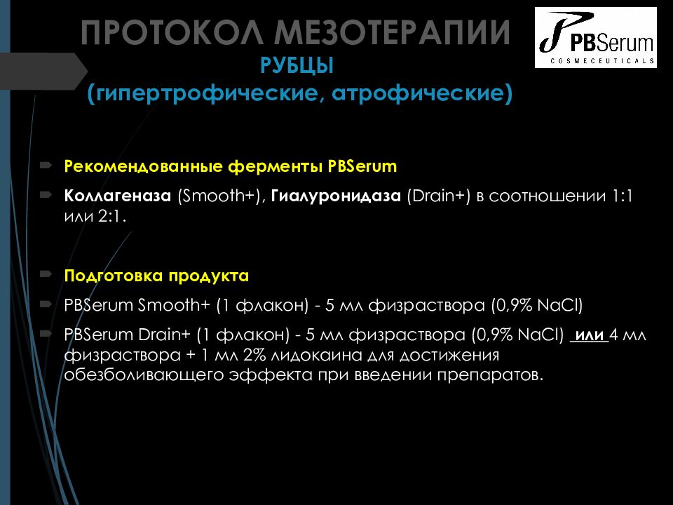 Рекомендованные ферменты PBSerum Коллагеназа ( Smooth +), Гиалуронидаза ( Drain +) в соотношении 1:1 или 2:1. Подготовка продукта PBSerum Smooth + (1 флакон ) - 5 мл физраствора (0,9% NaCl ) PBSerum Drain + (1 флакон ) - 5 мл физраствора (0,9% NaCl ) или 4 мл физраствора + 1 мл 2% лидокаина для достижения обезболивающего эффекта при введении препаратов. ПРОТОКОЛ МЕЗОТЕРАПИИ РУБЦЫ ( г ипертрофические, атрофические)