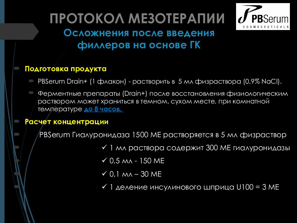 Подготовка продукта PBSerum Drain + (1 флакон ) - р астворить в 5 мл физраствора (0,9% NaCl ). Ферментные препараты ( Drain +) после восстановления физиологическим раствором может храниться в темном, сухом месте, при комнатной температуре до 8 часов. Расчет концентрации PBSerum Гиалуронидаза 1500 МЕ растворяется в 5 мл физраствор 1 мл раствора содержит 300 МЕ гиалуронидазы 0,5 мл - 150 МЕ 0,1 мл – 30 МЕ 1 деление инсулинового шприца U 100 = 3 МЕ