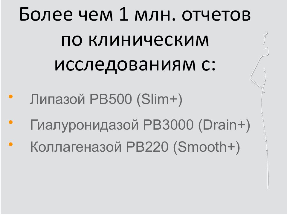 Липазой PB500 (Slim+) Гиалуронидазой PB3000 (Drain +) Коллагеназой PB220 ( Smooth+)