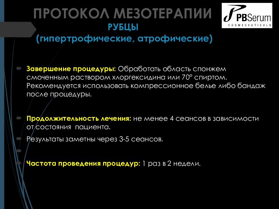 Завершение процедуры: Обработать область спонжем смоченным раствором хлоргексидина или 70° спиртом. Рекомендуется использовать компрессионное белье либо бандаж после процедуры. Продолжительность лечения : не менее 4 сеансов в зависимости от состояния пациента. Результаты заметны через 3-5 сеансов. Частота проведения процедур : 1 раз в 2 недели. ПРОТОКОЛ МЕЗОТЕРАПИИ РУБЦЫ ( г ипертрофические, атрофические)